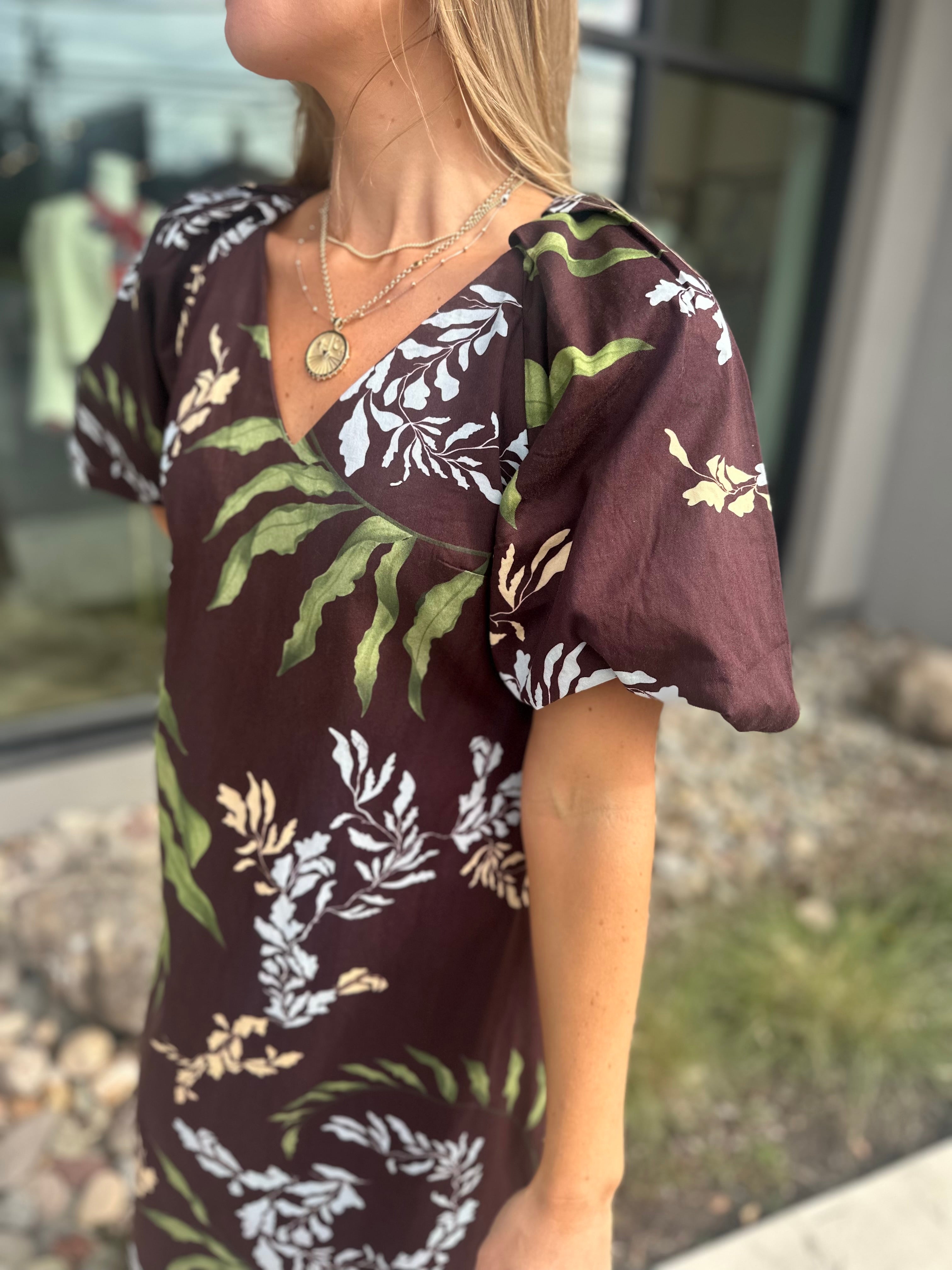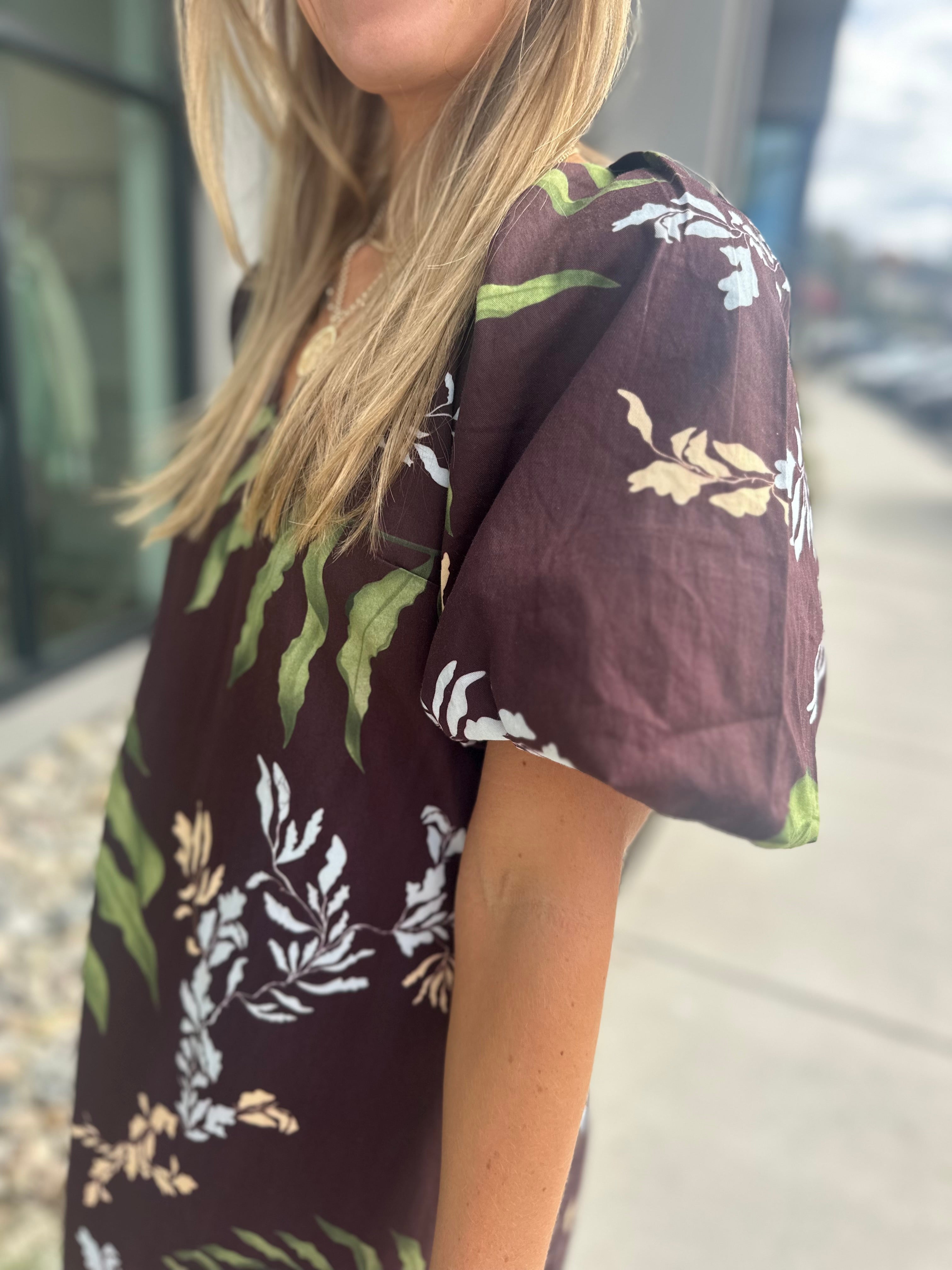 The Allie Midi Dress embodies effortless elegance with its relaxed silhouette and striking tropical print. Shown in the Black Frond pattern, this dress features soft puff sleeves and a flattering V-neckline that adds just the right touch of femininity. Crafted from lightweight cotton, it drapes beautifully for an easy, polished look that transitions seamlessly from day to night. Pair it with sandals for brunch or elevate it with heels and gold jewelry for an evening out.