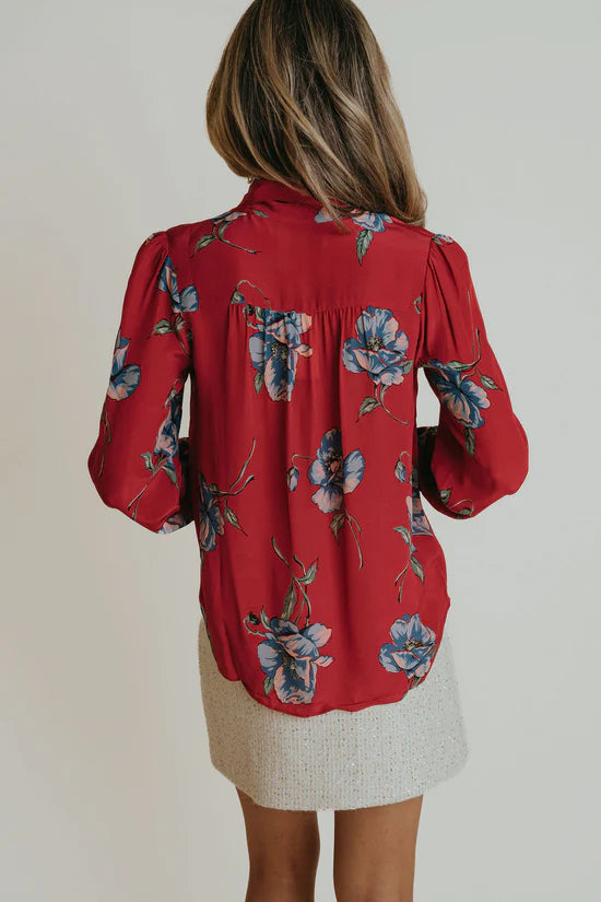Feminine and timeless, the Anna Blouse by La Roque is crafted from 100% viscose for a soft, elegant drape. Featuring a self-tie bow neckline, gathered shoulders, and long sleeves with button cuffs, this blouse blends sophistication with ease. The vibrant crimson floral print makes it the perfect statement piece for pairing with tailored skirts or your favorite denim.