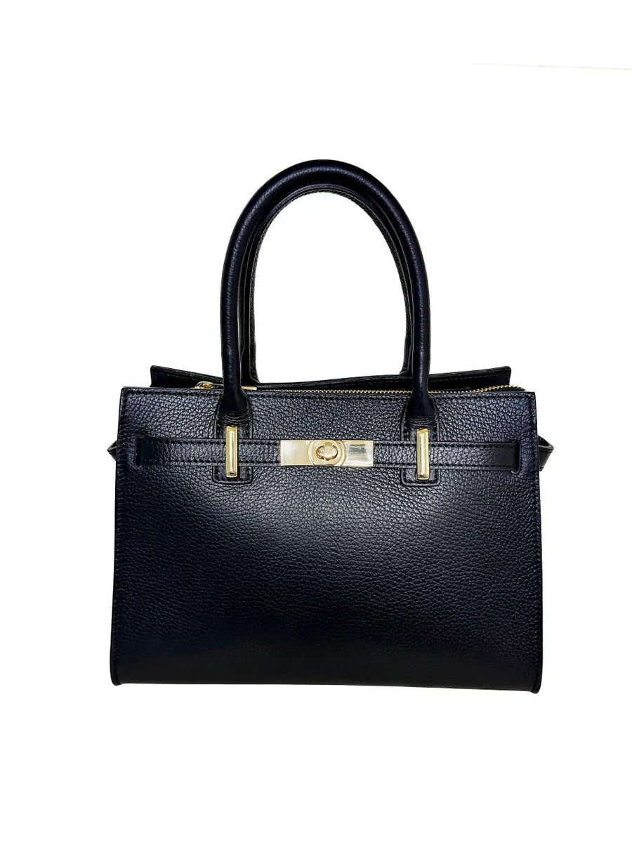 A true wardrobe staple with enduring elegance. This classic medium top-handle bag is crafted from richly textured pebbled leather and finished with refined gold-tone hardware for a polished, timeless look. The structured silhouette offers the perfect balance of sophistication and function, with ample space for daily essentials while maintaining a sleek, ladylike shape. Designed to carry you from workdays to weekends and everywhere in between, this is the kind of bag that never goes out of style.