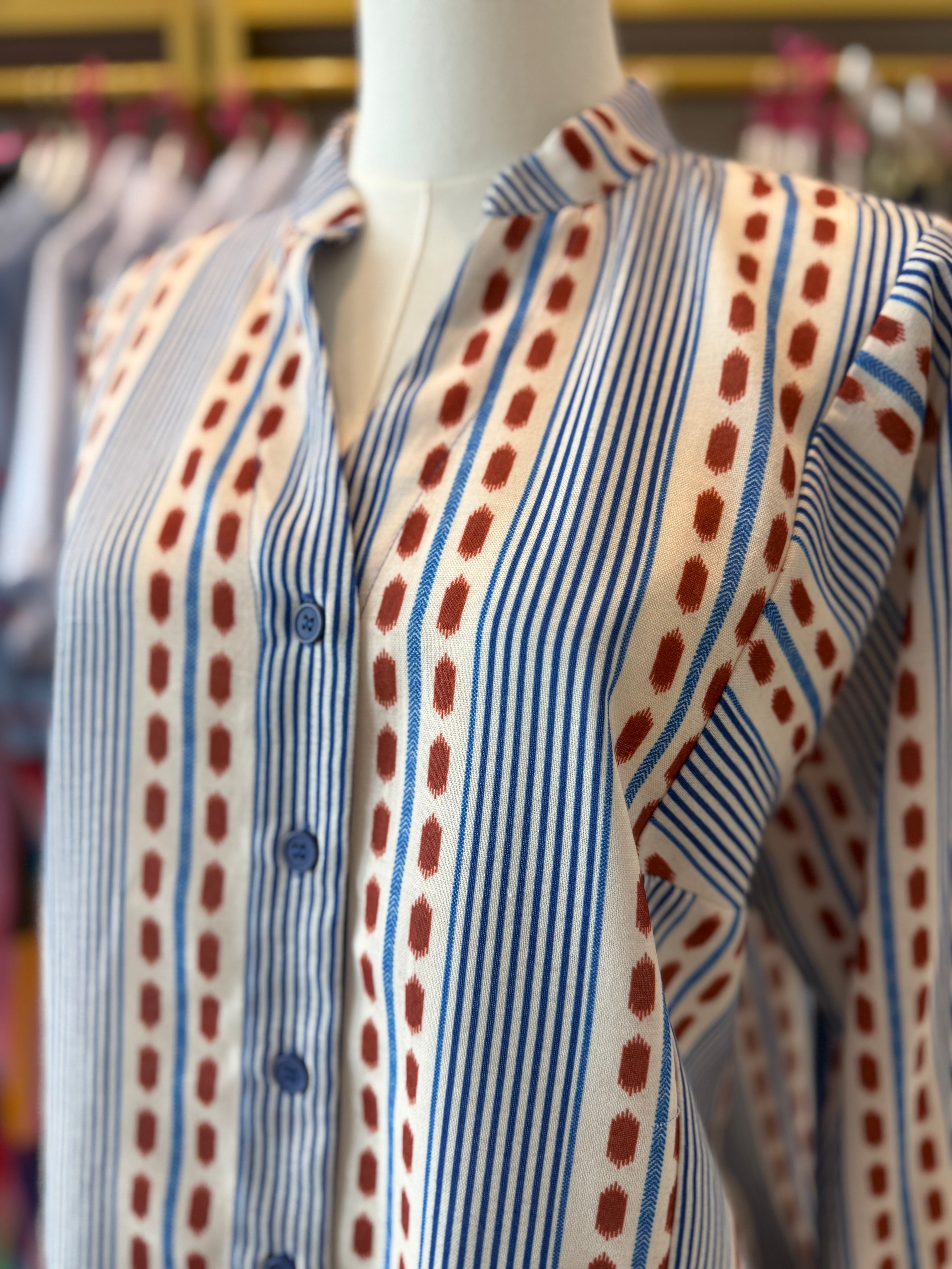 This Joy Joy button-front shirt is all about effortless polish with a playful twist. Designed in the eye-catching Colonial Stripe print, it features a mix of classic blue stripes and warm rust contrast detailing for a look that feels both timeless and fresh. The relaxed silhouette, split neckline, and lightweight fabric make it an easy everyday piece—perfect for dressing up denim or pairing with tailored bottoms for work or