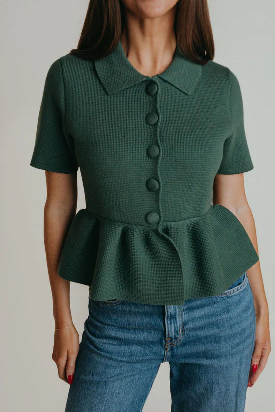The Daisy Top by La Roque blends classic charm with modern sophistication. Crafted from a soft cotton knit, this short sleeve peplum top features a structured silhouette with a flattering waist and a playful flared hem. Covered button detailing and a collared neckline add a tailored touch, while the rich spruce hue makes it a standout piece for any season. Perfect for pairing with denim or tailored trousers for a chic, put-together look.