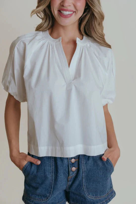 A modern split Henley neckline is complemented by subtle gathered detailing at the collar, creating a flattering drape through the body. The short sleeves offer a touch of volume, while the clean hem keeps the look crisp and refined.