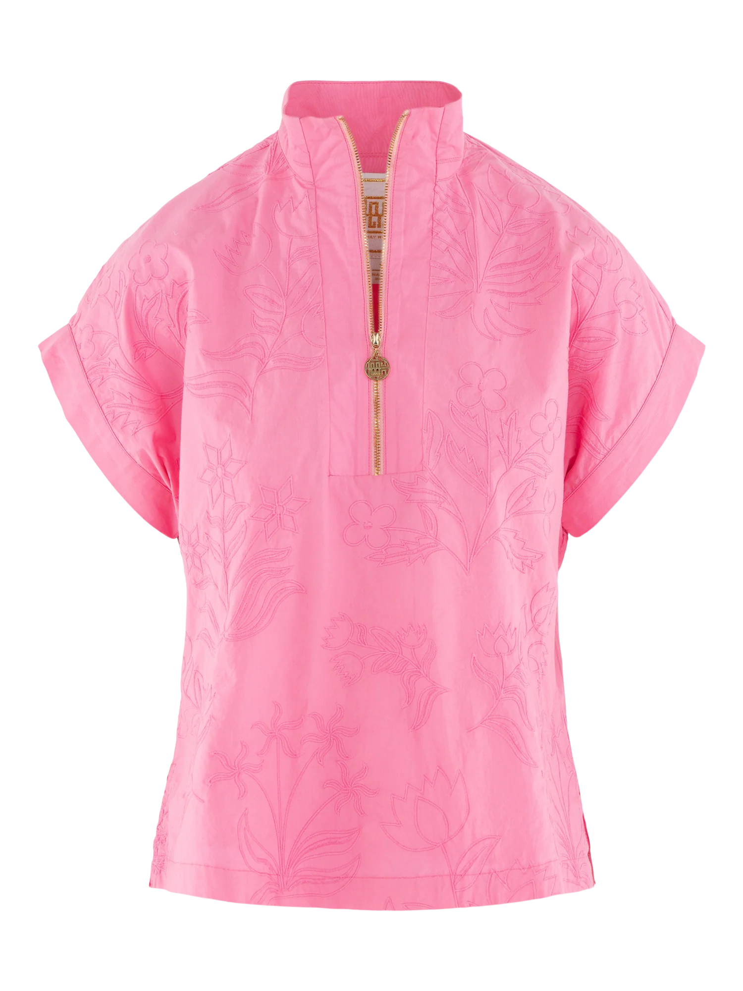 The Poppy Pullover in Rosé is an everyday essential with an easygoing, feminine edge. Designed with a classic stand collar and a ¾-zip neckline finished with our signature gold pull, this style balances structure with ease. Short dolman sleeves and a subtly tailored silhouette create a clean, flattering shape, while tonal embroidered florals lend quiet texture and depth throughout. Elevated yet easeful, it’s a modern pullover that feels considered, distinctive, and undeniably chic.
