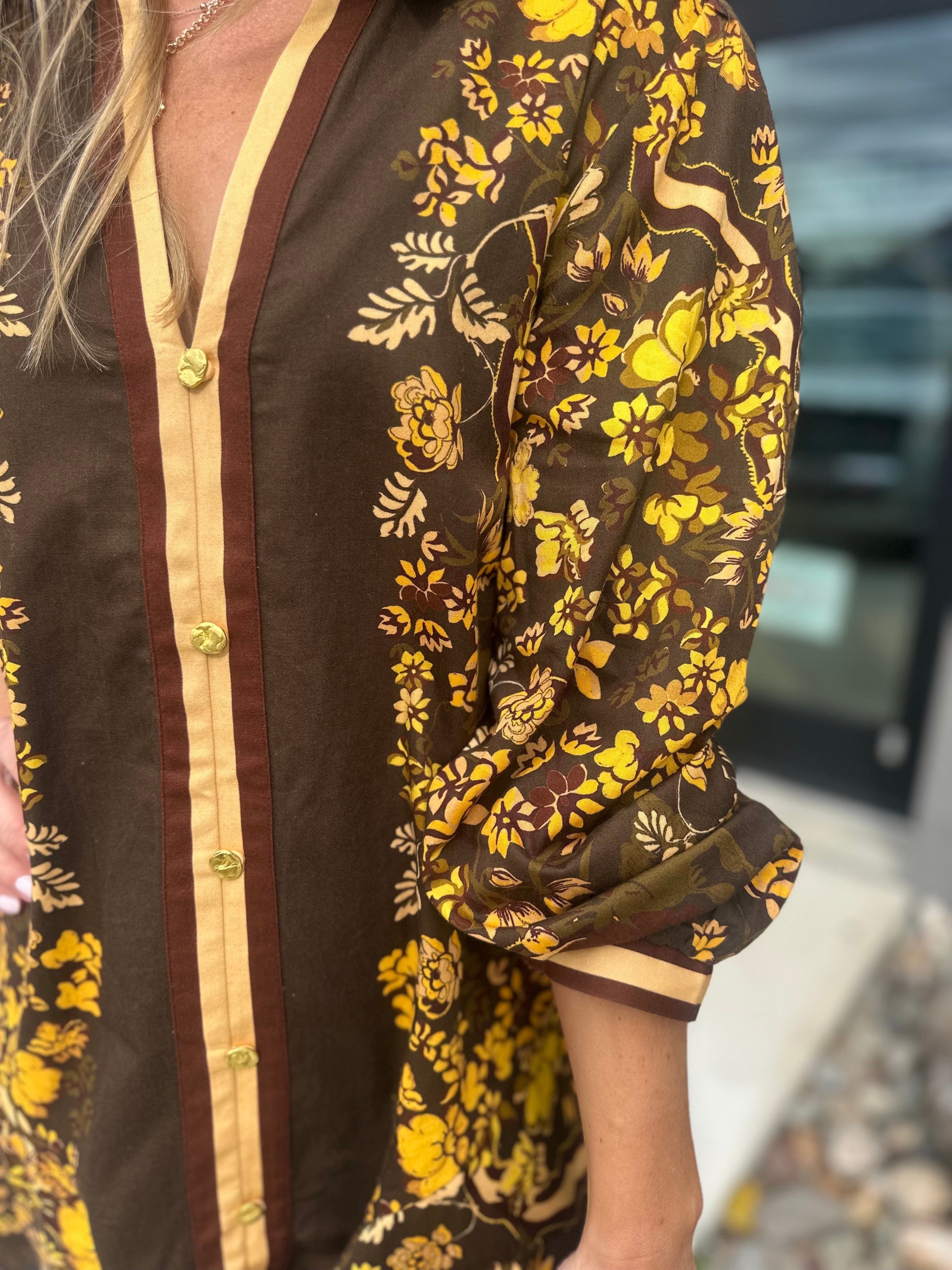 The Porter Dress is a standout fall favorite with its bold floral print and warm, earthy tones. Designed in a structured cotton blend, it features a collared neckline, button-front closure, and subtle A-line silhouette that flatters every figure. The long sleeves with soft volume add a feminine touch, while the golden floral pattern on a rich chocolate base makes this piece perfect for the season. Pair with tall boots for a polished daytime look or heels for evening gatherings.