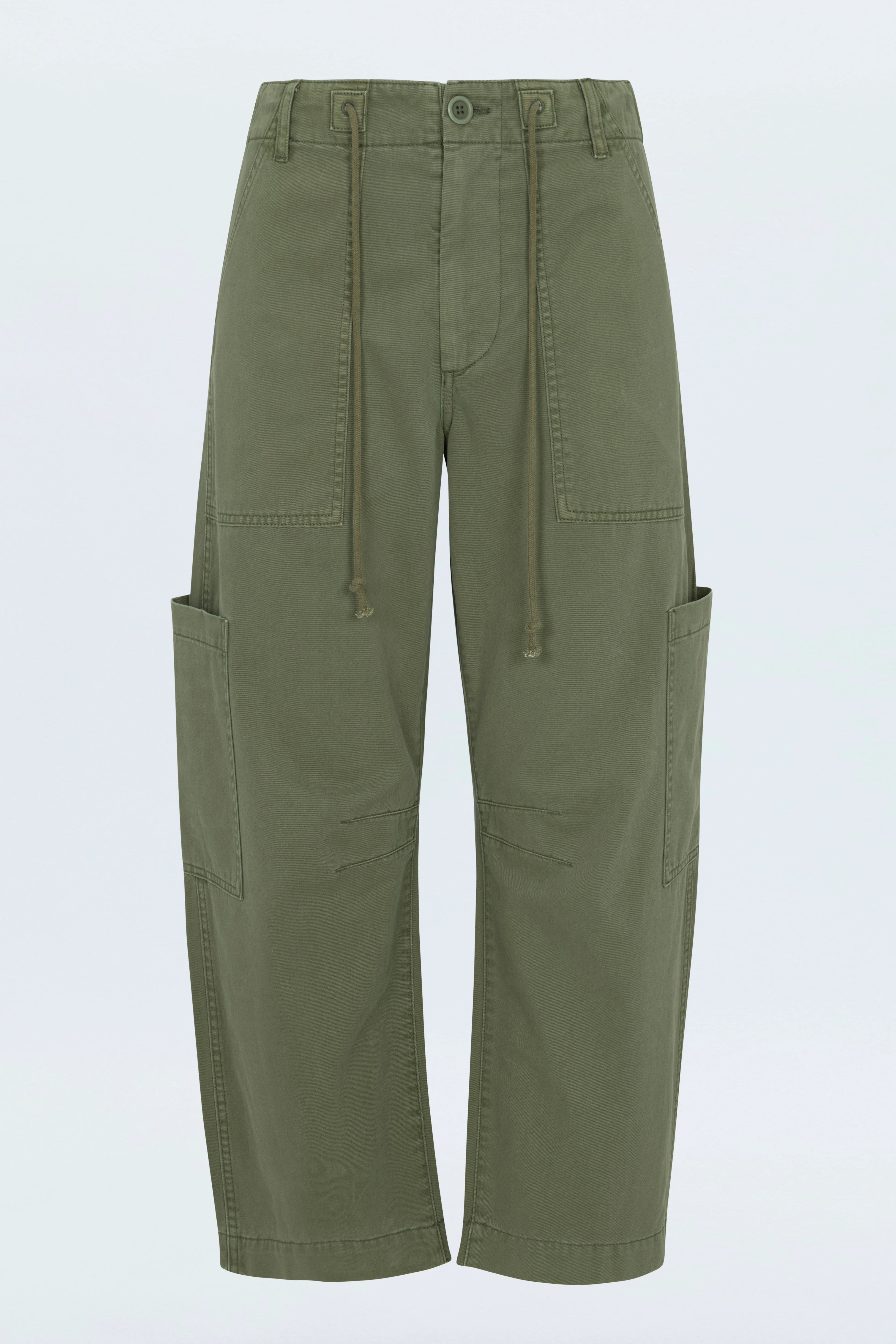 Utility, with a feminine edge. Sabrina delivers a flattering take on utility with a curved wide leg, front patch pockets, and an easy drawstring waist. The cropped 27" inseam shows just the right amount of ankle, while the soft 100% cotton fabric moves with you. Finished in Meadow, a rich green that pairs effortlessly with neutrals or prints.