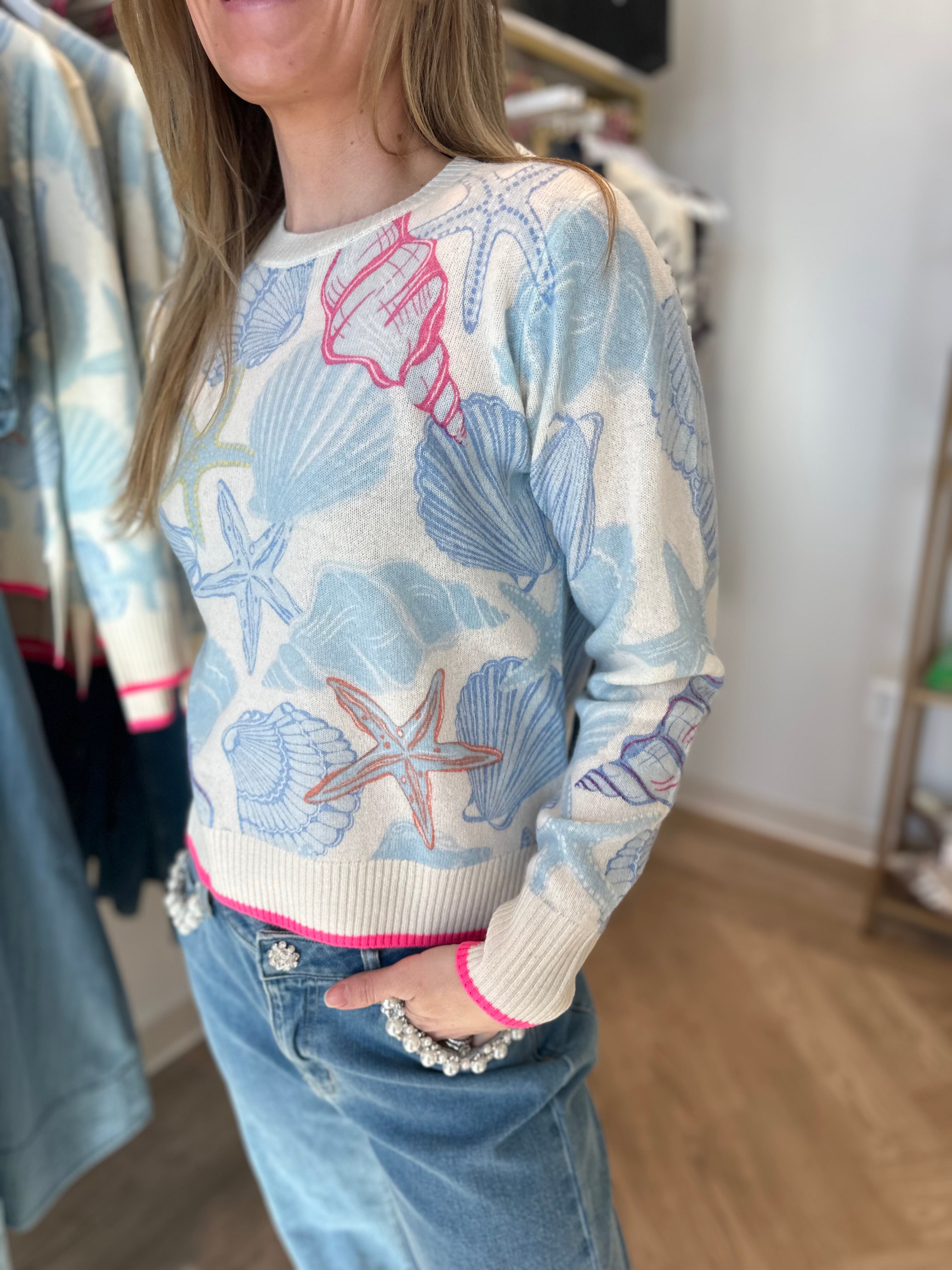 A fresh take on a classic crew. The Scatter Shell Crew Sweater by Brodie Cashmere features an allover coastal-inspired shell and starfish print in soft blues with playful pops of color. Finished with contrast pink trim at the hem and cuffs, this lightweight knit is equal parts cozy and fun. Perfect with denim for an easy, polished everyday look.