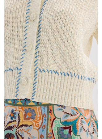 Soft, sweet, and effortlessly polished, the Spacedye Gia Cardigan by Allison NY is a fresh take on a classic knit. Crafted in a creamy spacedye yarn with delicate blue contrast stitching, this cardigan features a timeless button-front silhouette with subtle ribbed trim for a flattering, tailored fit. Lightweight yet cozy, it’s the perfect layering piece for transitional days—equally chic styled with tailored shorts, denim, or a statement skirt.