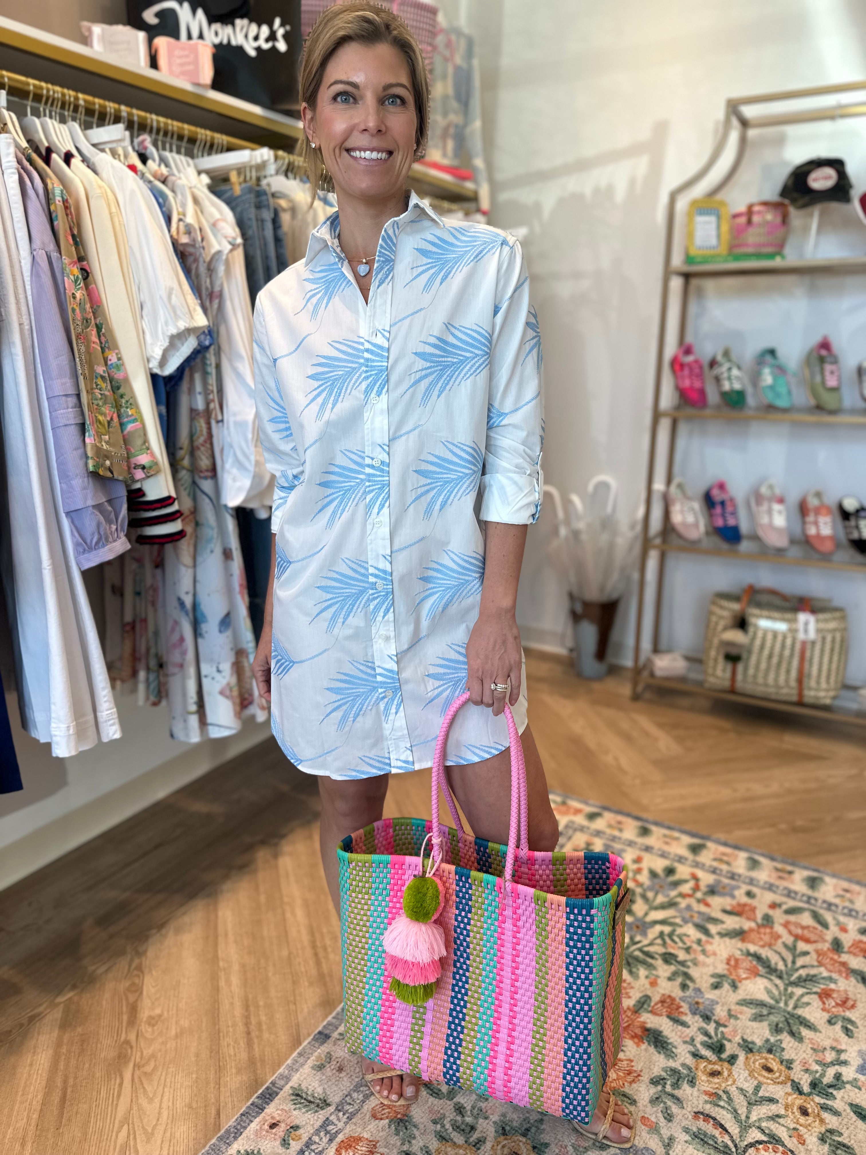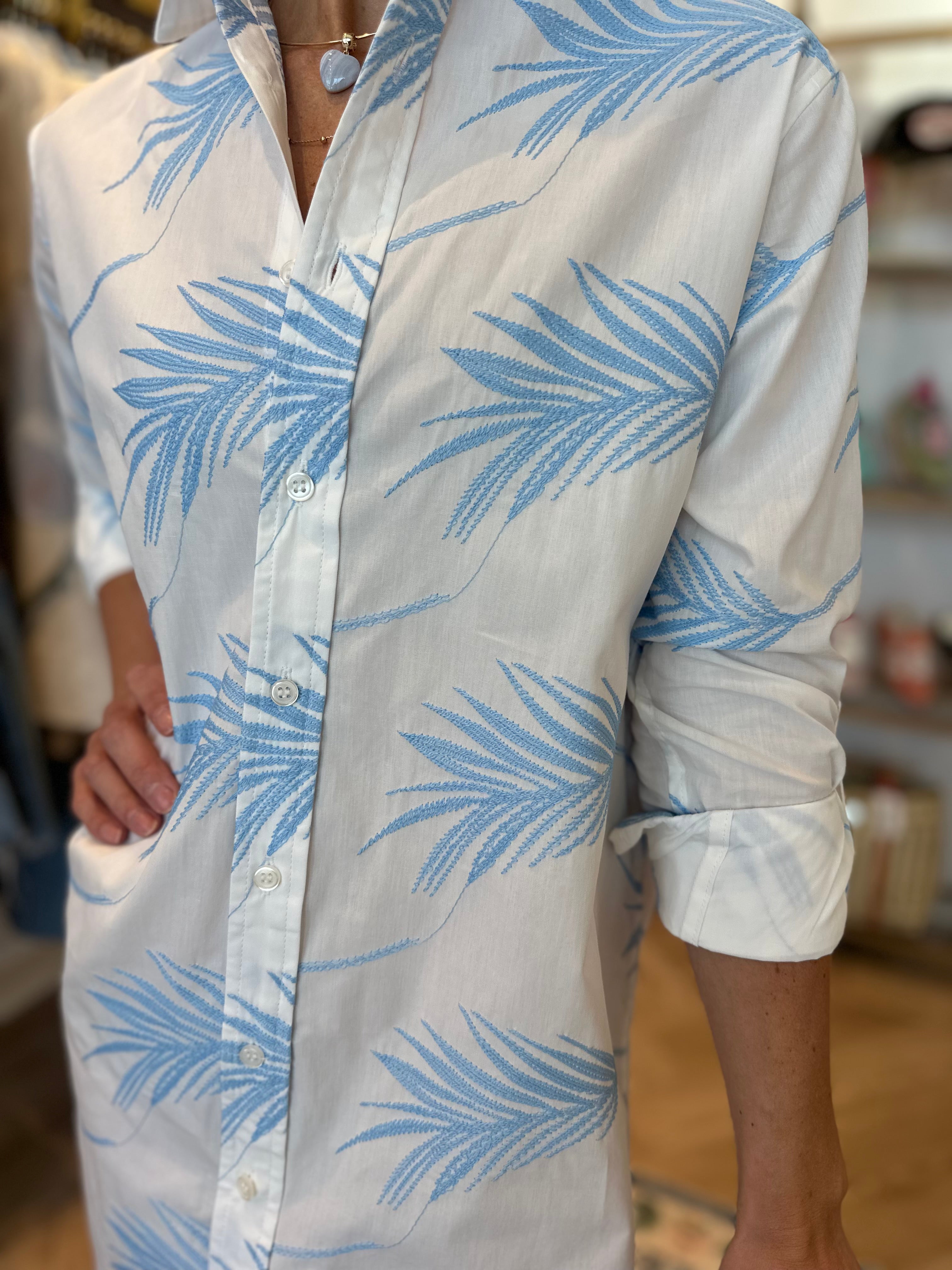 Designed in a lightweight, breathable fabric, this classic button-front silhouette features a relaxed, easy fit with a crisp collar and roll-tab sleeves for versatile styling. The soft blue palm-inspired print adds a hint of resort charm, making it feel equal parts elevated and easy.