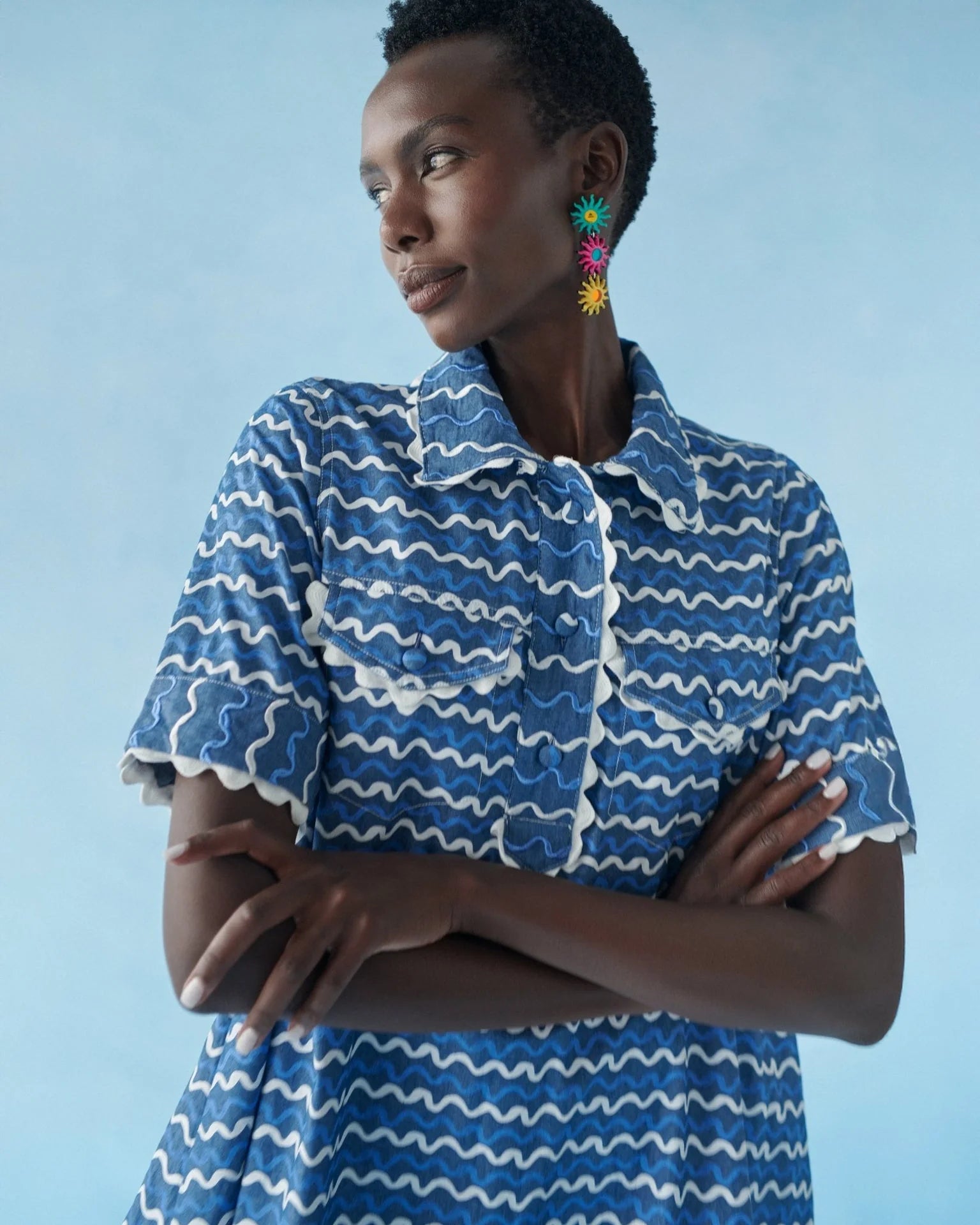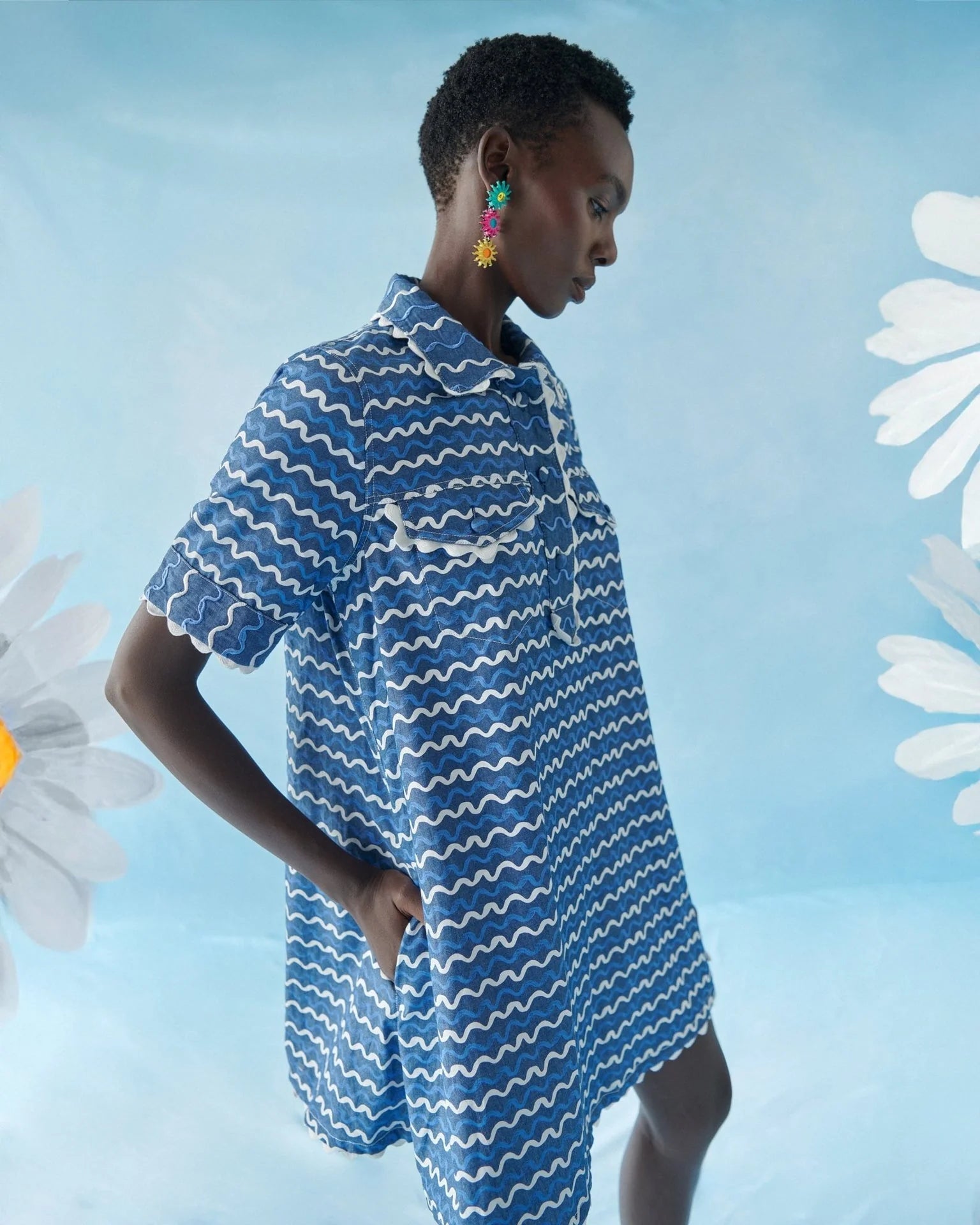 Playful, fresh, and full of personality, the Blueberry Wave Dress by Celia B captures the brand’s signature bold spirit. Crafted from lightweight denim and finished in an exclusive blue and white wave print, this mini shirt dress delivers effortless summer style with a fun, modern twist. The classic shirt collar and partial button-front closure give it a polished feel, while front pockets and scalloped trim detailing along the collar, pockets, sleeves, and hem add charming dimension to the design. With its easy silhouette and eye-catching print, this standout piece is perfect for sunny days, weekend outings, and vacation adventures.
