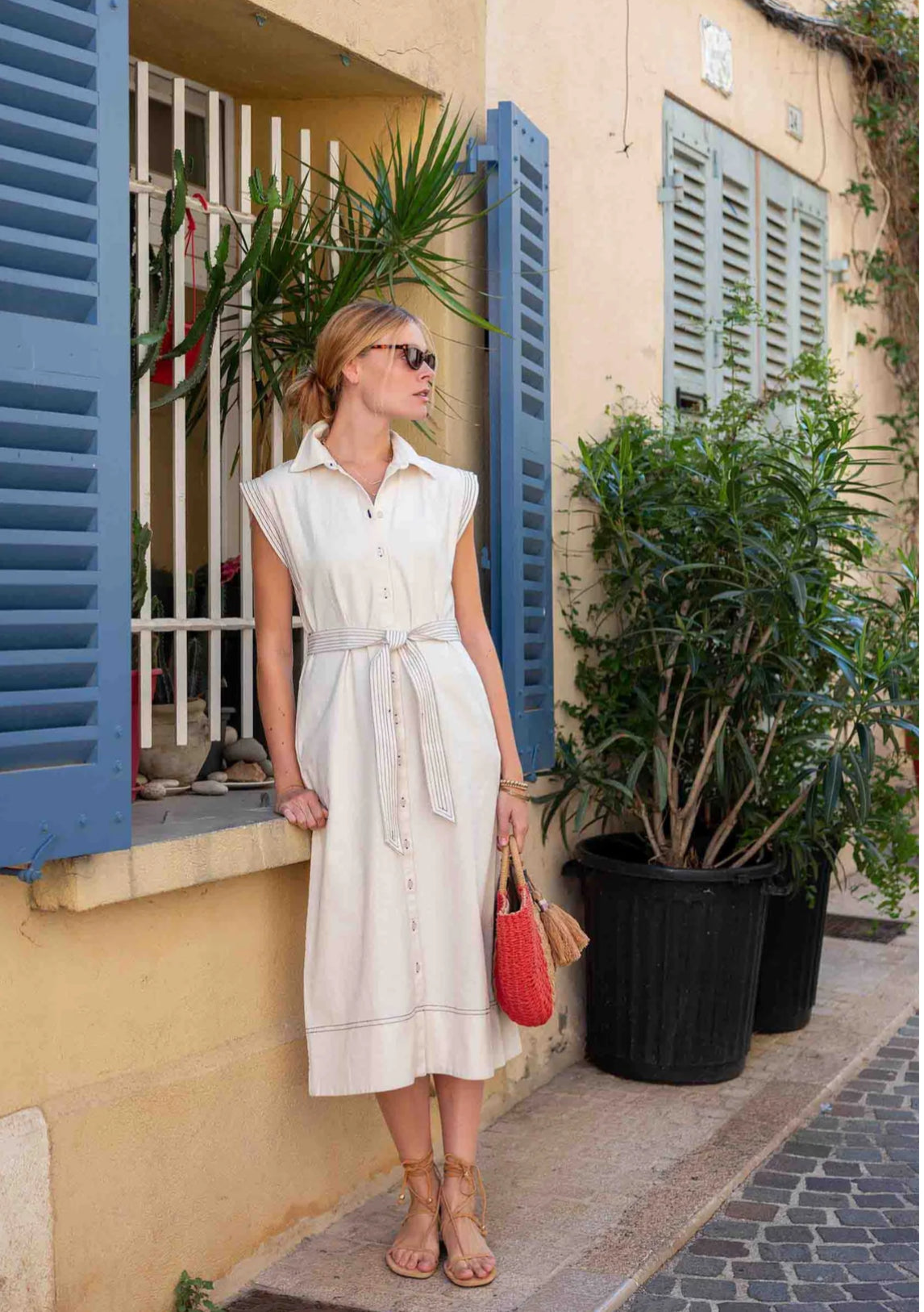 The softly structured bodice flows into a flattering flared skirt, while the removable self-tie belt cinches the waist for a more defined shape (or wear it loose for a relaxed, effortless look). Subtle yet striking, the contrast navy trapunto stitching along the armholes, belt, and hem adds a refined, elevated touch that sets this piece apart.