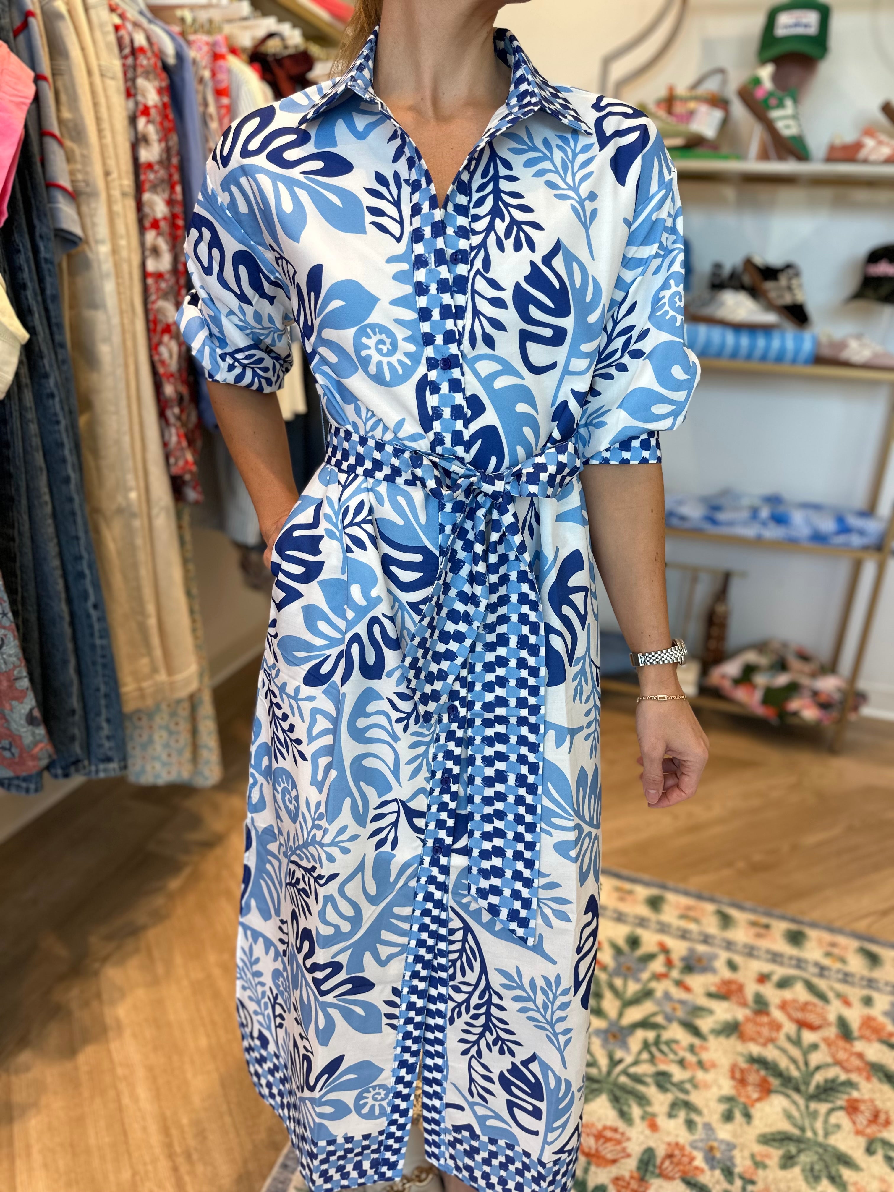 The refreshing Lagoon Leaf print showcases shades of blue and soft coastal tones in a bold botanical pattern that feels both modern and sophisticated. A coordinating tie belt cinches the waist for a flattering, feminine shape, while the flowing maxi length creates an elegant silhouette with graceful movement.