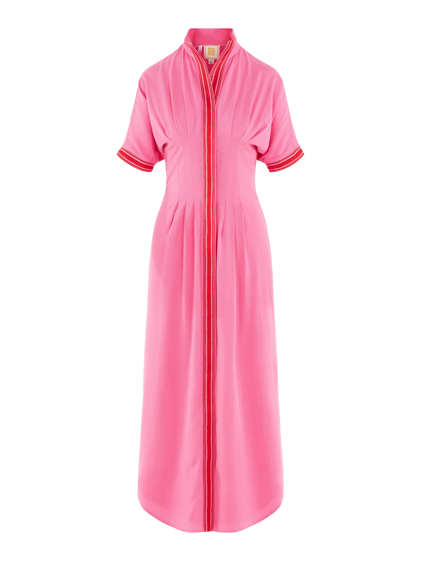 The Georgia Dress in Pink Carnation brings a fresh, playful energy to a polished silhouette. Designed with a classic stand collar and short dolman sleeves, this style features a tailored shape that feels structured yet effortless. Bold red trim along the sleeve cuffs and down the front button panel adds a vibrant pop of contrast, highlighting the clean lines of the design. Crafted in a fabric that moves with you, this dress drapes beautifully while delivering an elevated look with a joyful twist.