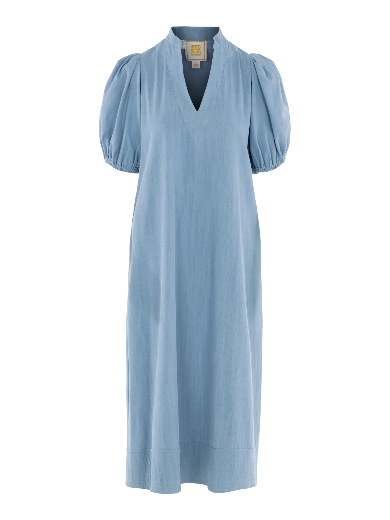The Hampton Dress in Denim Chambray is an effortless, seasonless silhouette designed for everyday wear. It features a mandarin-style collar with a clean v-neckline, elastic puff sleeves, and a loose-fitting shape that offers ease and comfort throughout the day. Finished with functional side pockets, this elevated basic balances practicality with timeless design in a lightweight chambray fabrication.