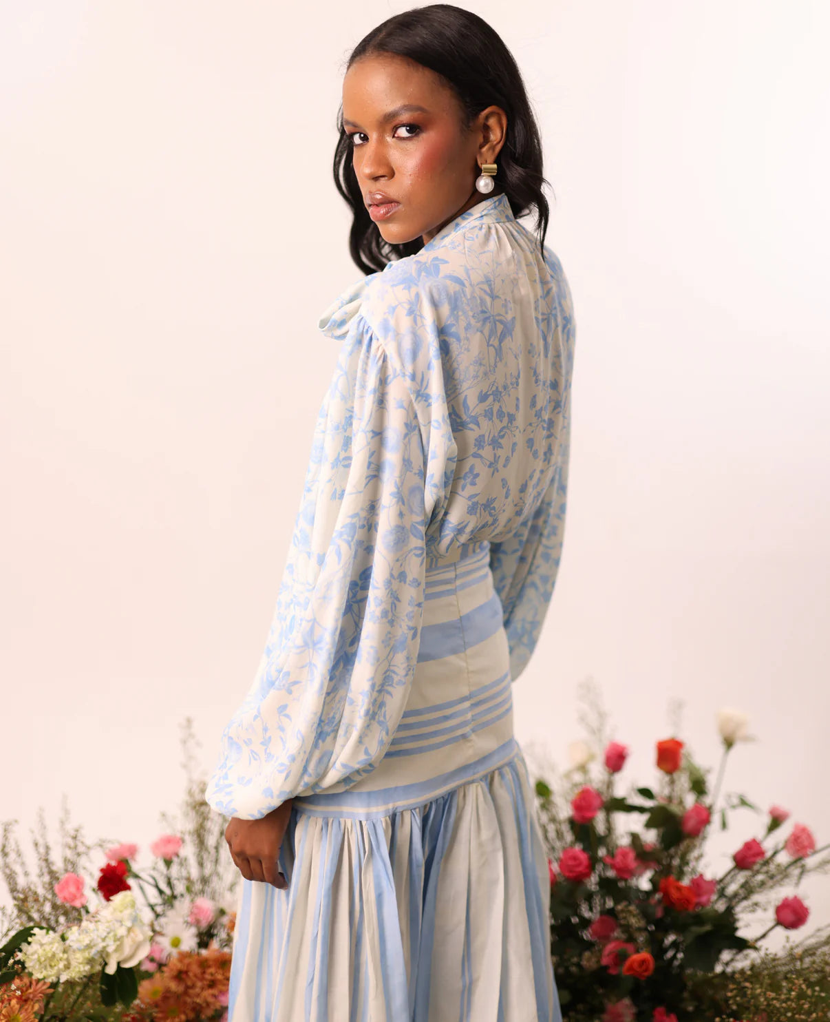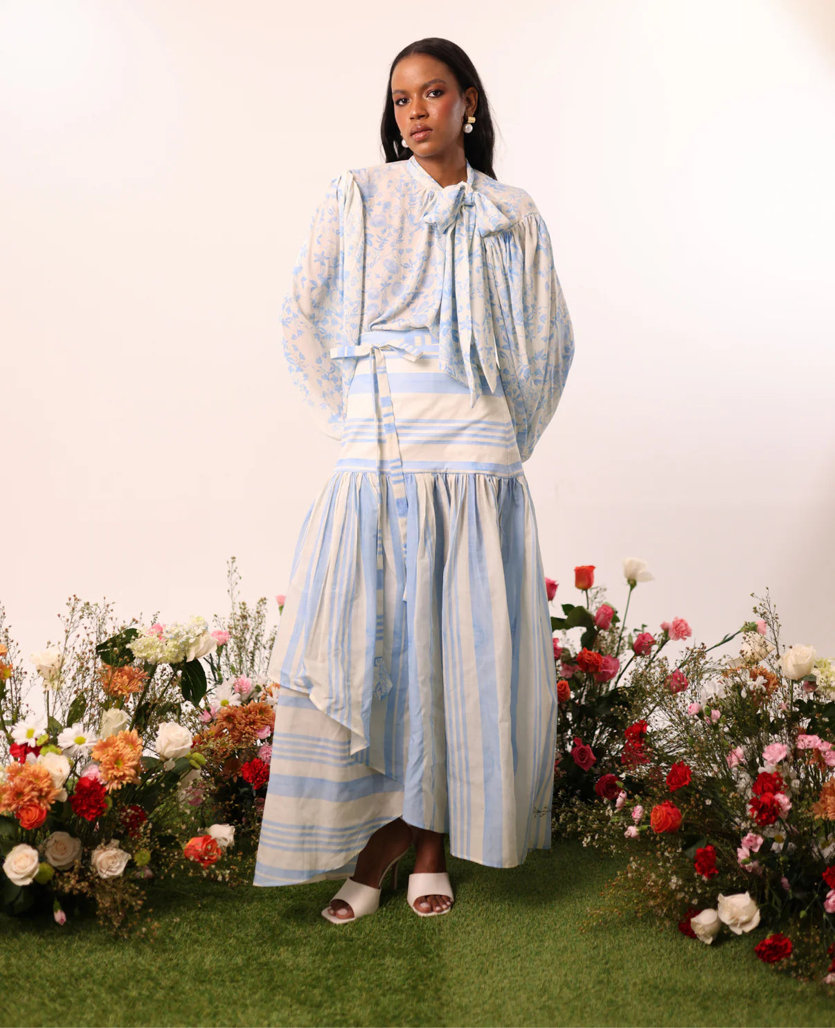 Long balloon-sleeved blouse with elastic cuffs, designed in a loose silhouette for a comfortable and elegant fit. It features a high neck with an adjustable tie, adding a romantic and versatile touch. Made of fabric printed with delicate green flowers, it combines freshness and femininity.
