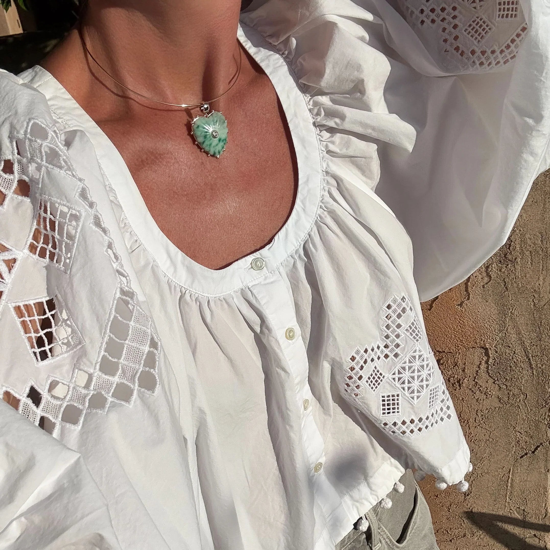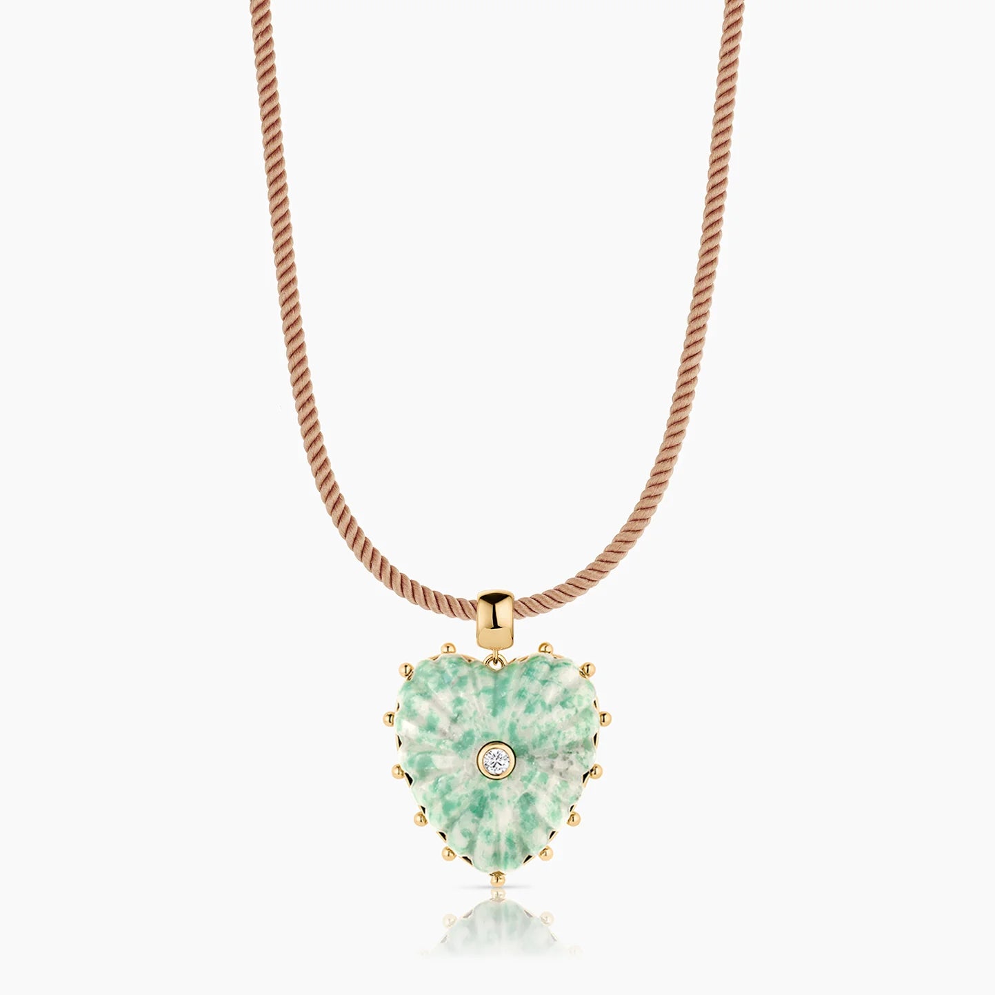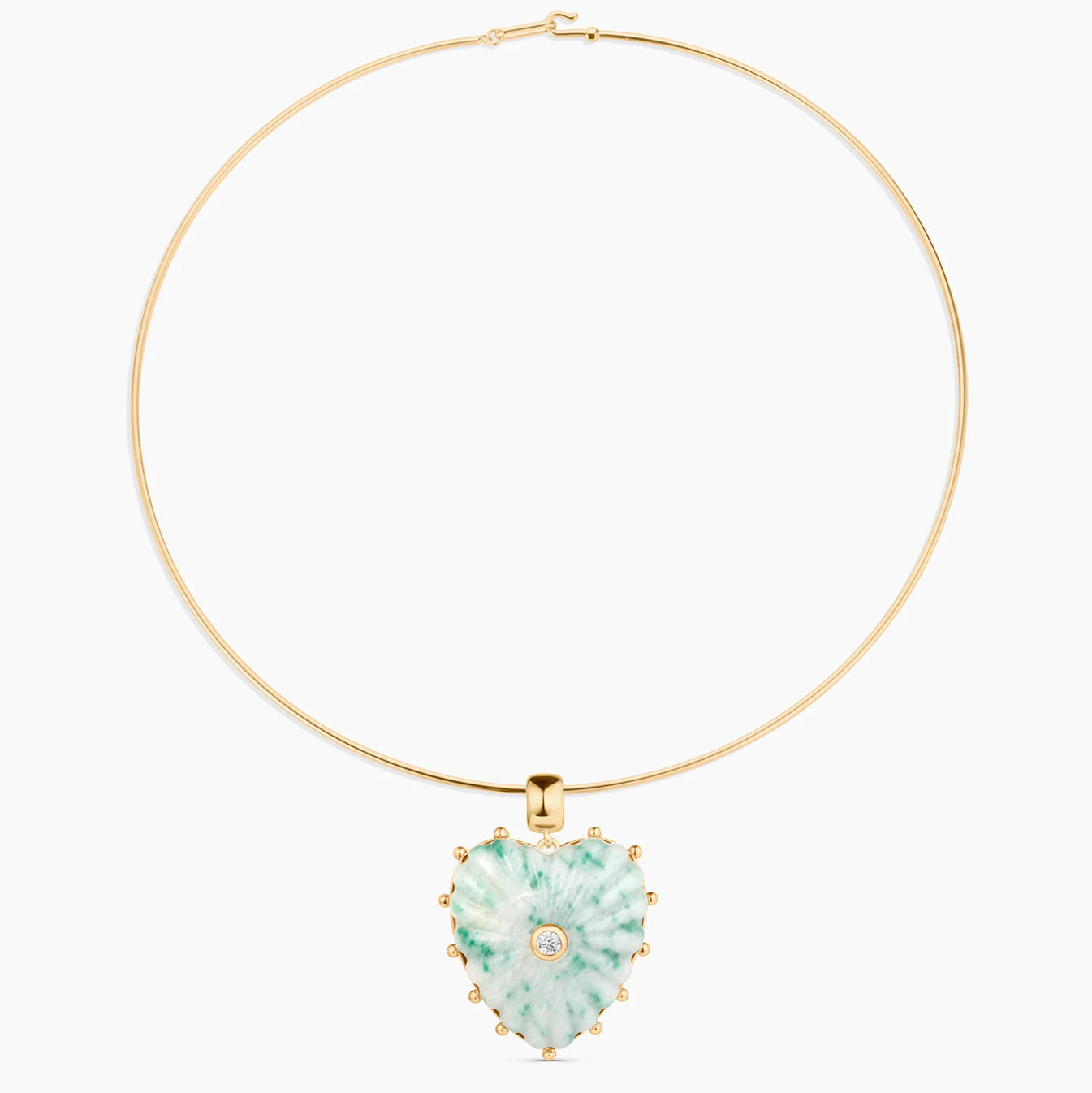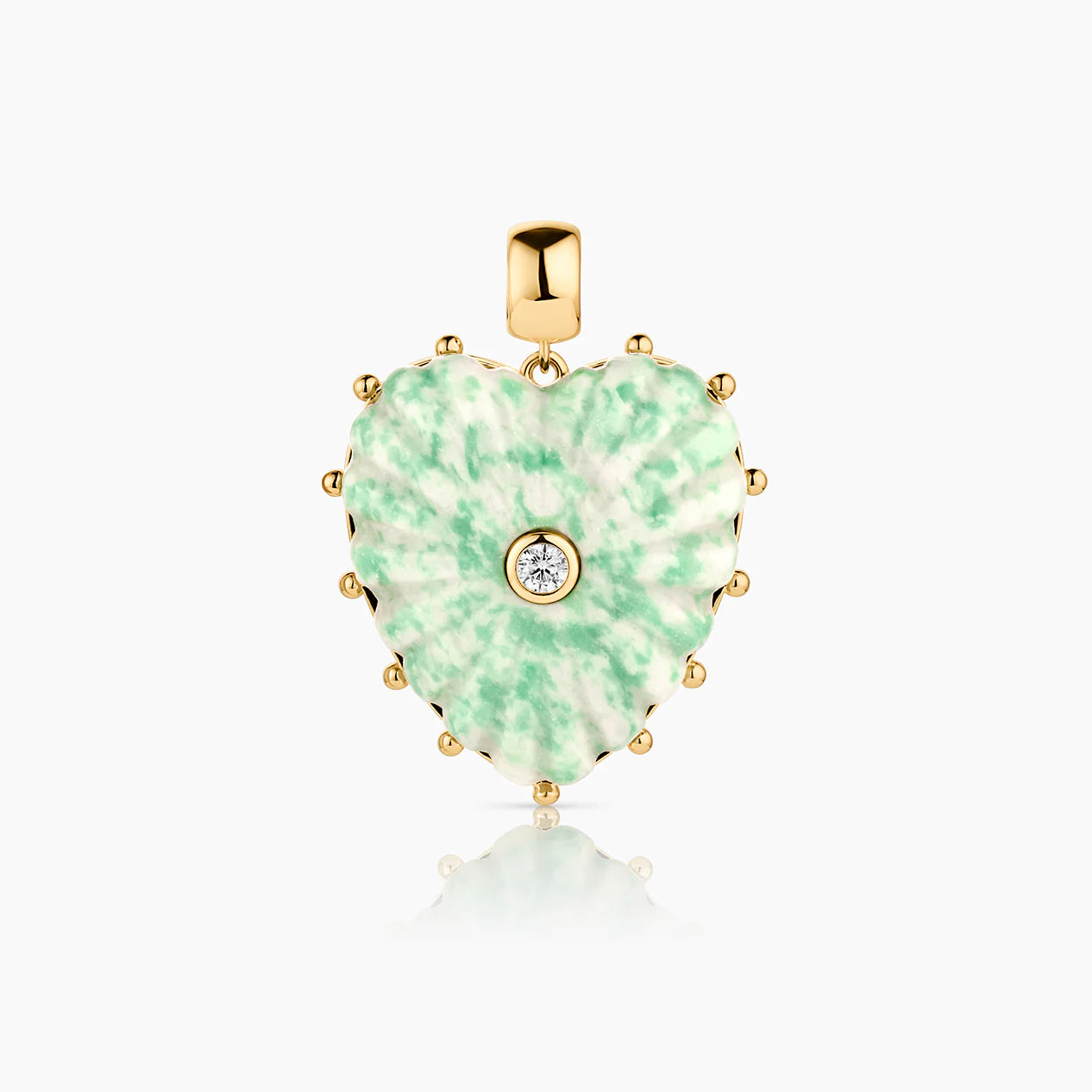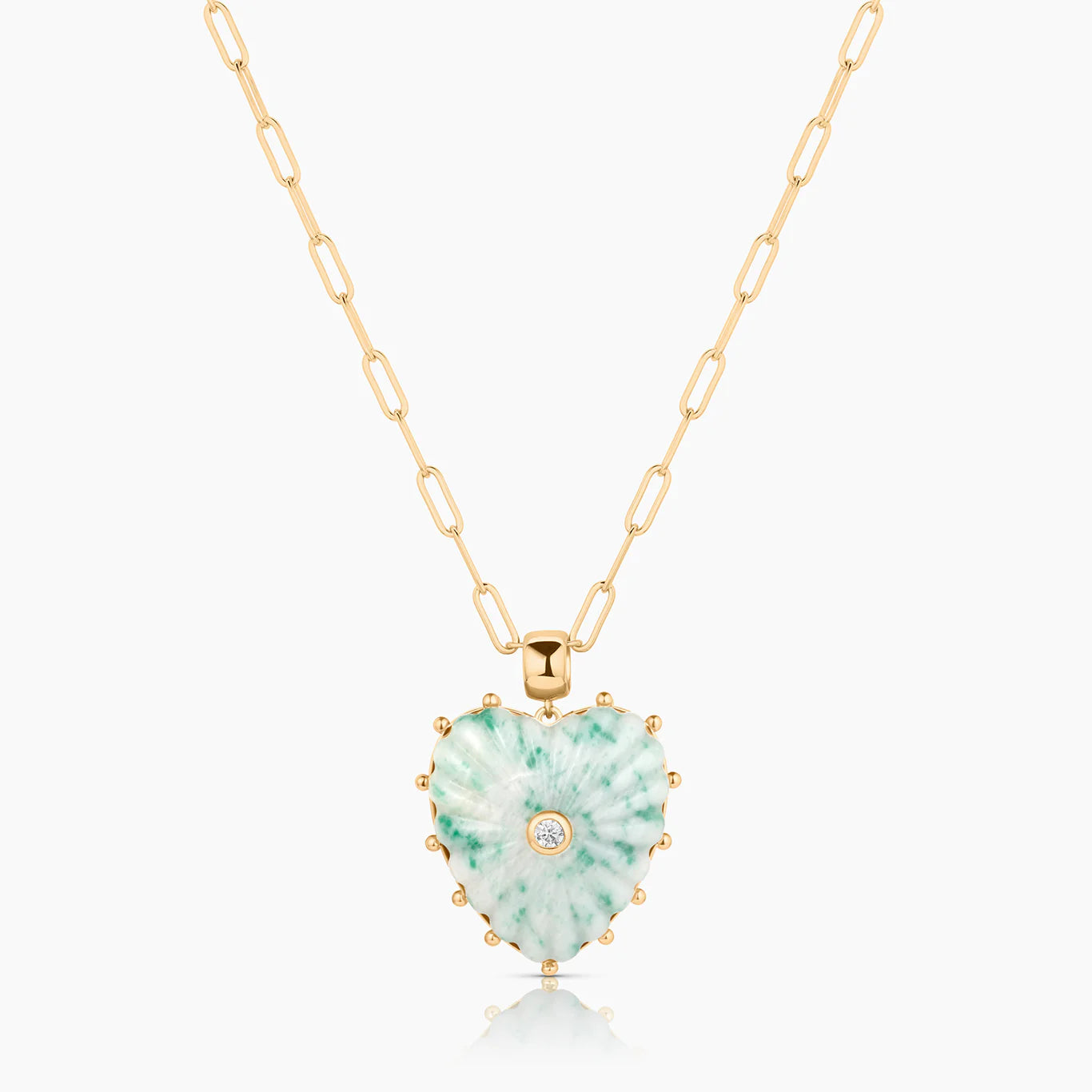 Thatch’s Malene heart charm in the unique speckled green dot jasper—hand-carved stone, cubic zirconia, and high-shine gold on a large round bail for versatility. Everything you want and need to make a statement.