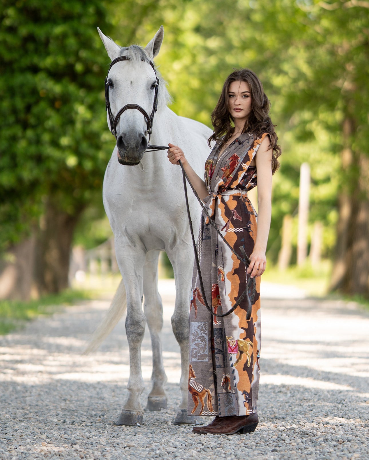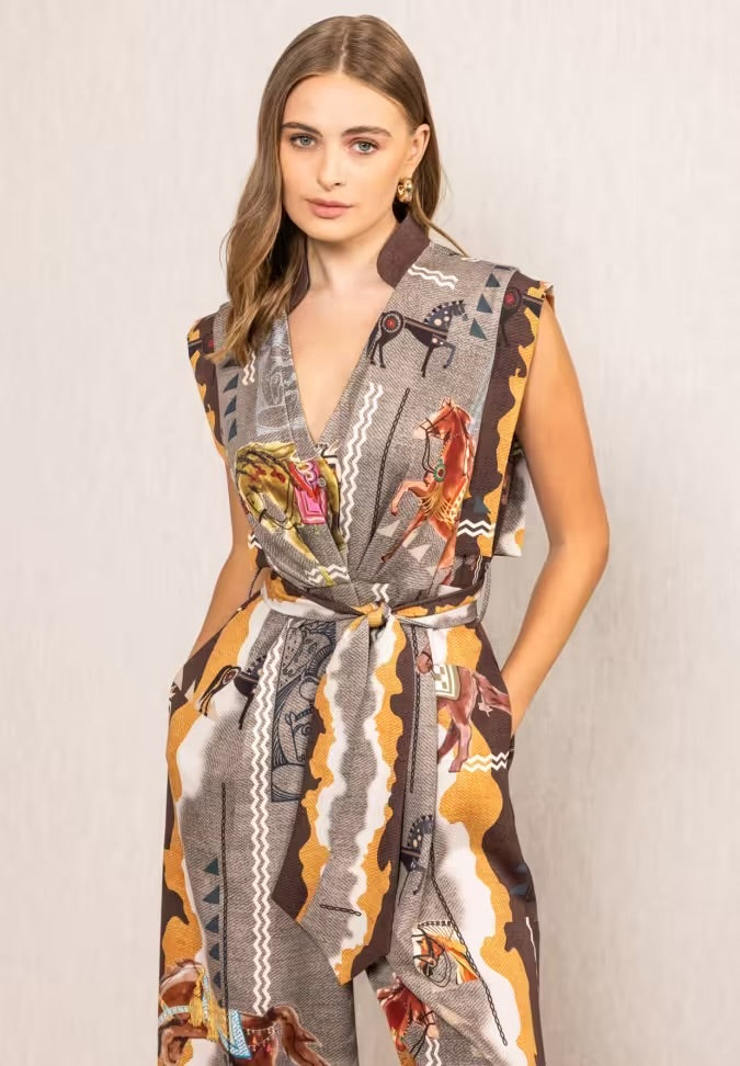 Bold, artistic, and effortlessly chic — the Mirage Belted Jumpsuit by Ranna Gill is a true statement piece for fall. Crafted in a soft, flowy fabric and adorned with Ranna’s signature equestrian-inspired print, this sleeveless silhouette blends earthy tones of caramel, taupe, and rust with hand-drawn horse motifs for a look that feels timeless yet modern.