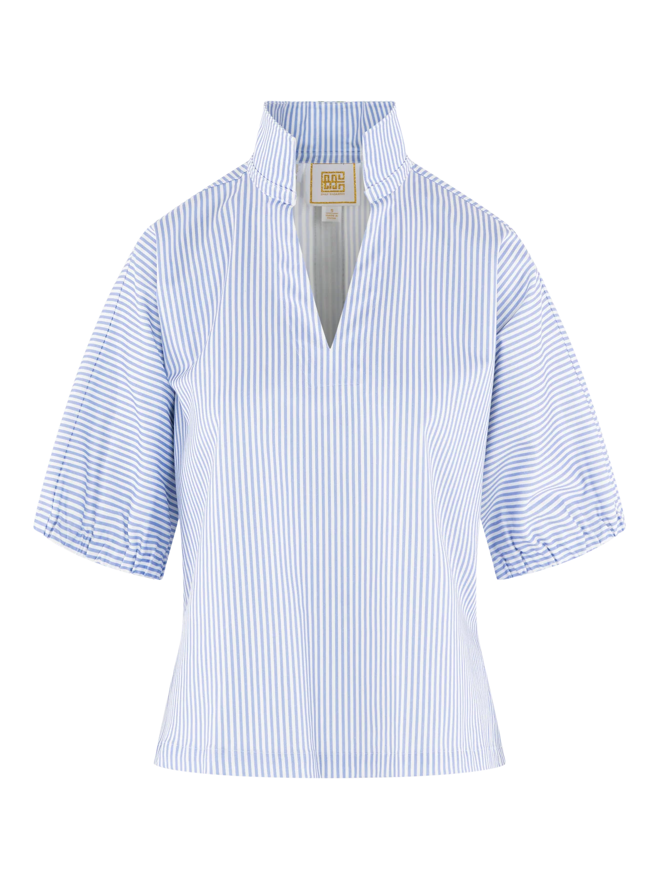 The Poppy Top in Grapemist Stripe is an effortless staple with a playful twist. Designed with a loose, easy silhouette, this style offers a relaxed feel while maintaining a polished look. Soft elastic dolman sleeves add gentle volume, balanced by a classic stand collar for a timeless finish. This top brings a fresh, spring-ready appeal, elevated by an unexpected pop of color along the back with green and blue trim. Thoughtfully detailed and endlessly wearable, this top delivers everyday ease with a touch of joyful distinction.