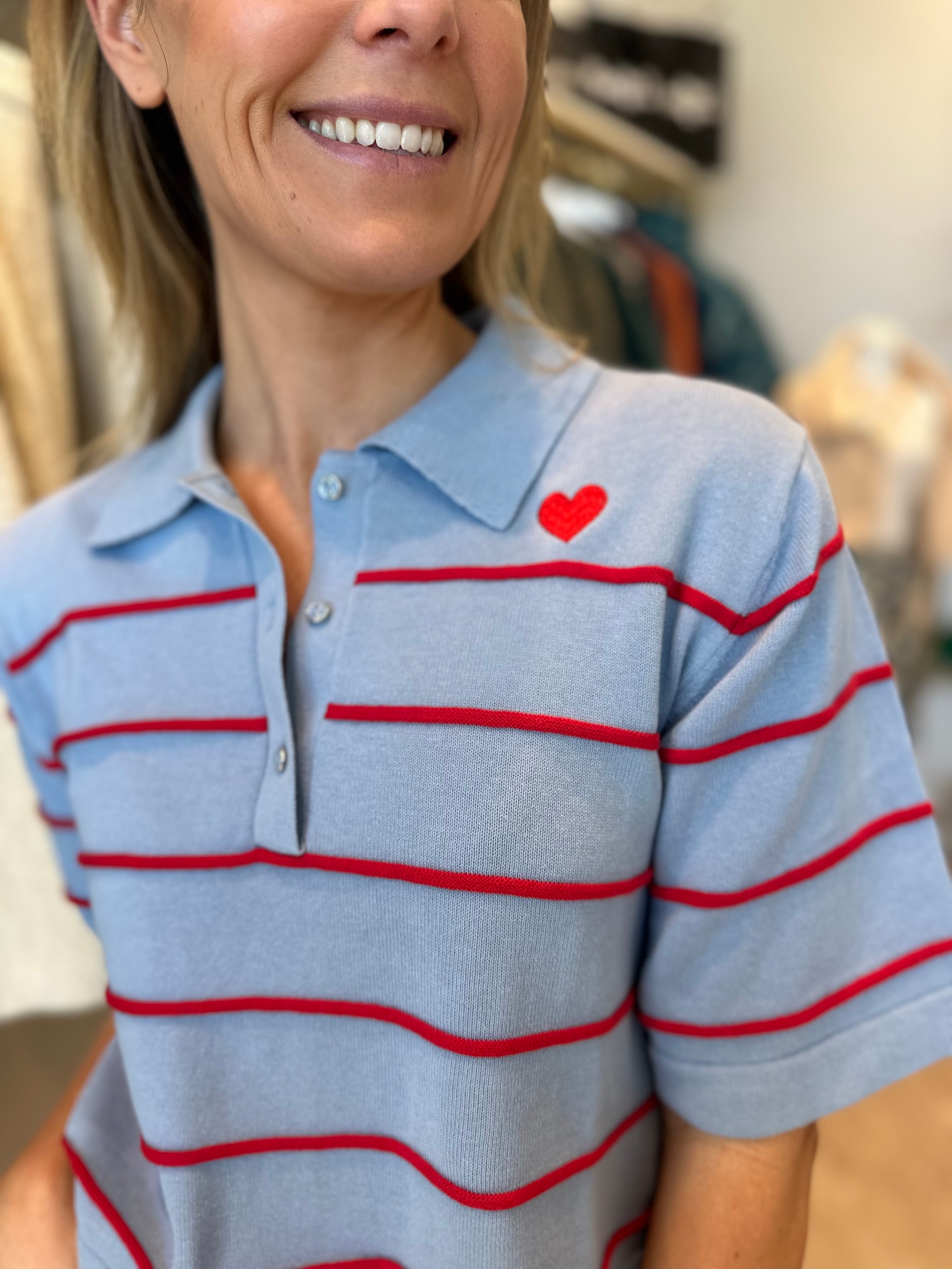 Sporty meets sweet in this effortlessly cool striped polo knit. Designed in a soft, lightweight knit with a flattering cropped silhouette, this top features classic red stripes on a soft blue base for a fresh, retro-inspired feel. The short sleeves and button-front polo collar keep it polished, while the subtle embroidered heart detail at the chest adds the perfect playful touch. Easy to style with high-rise denim, this piece is a fun everyday essential with just the right amount of personality.