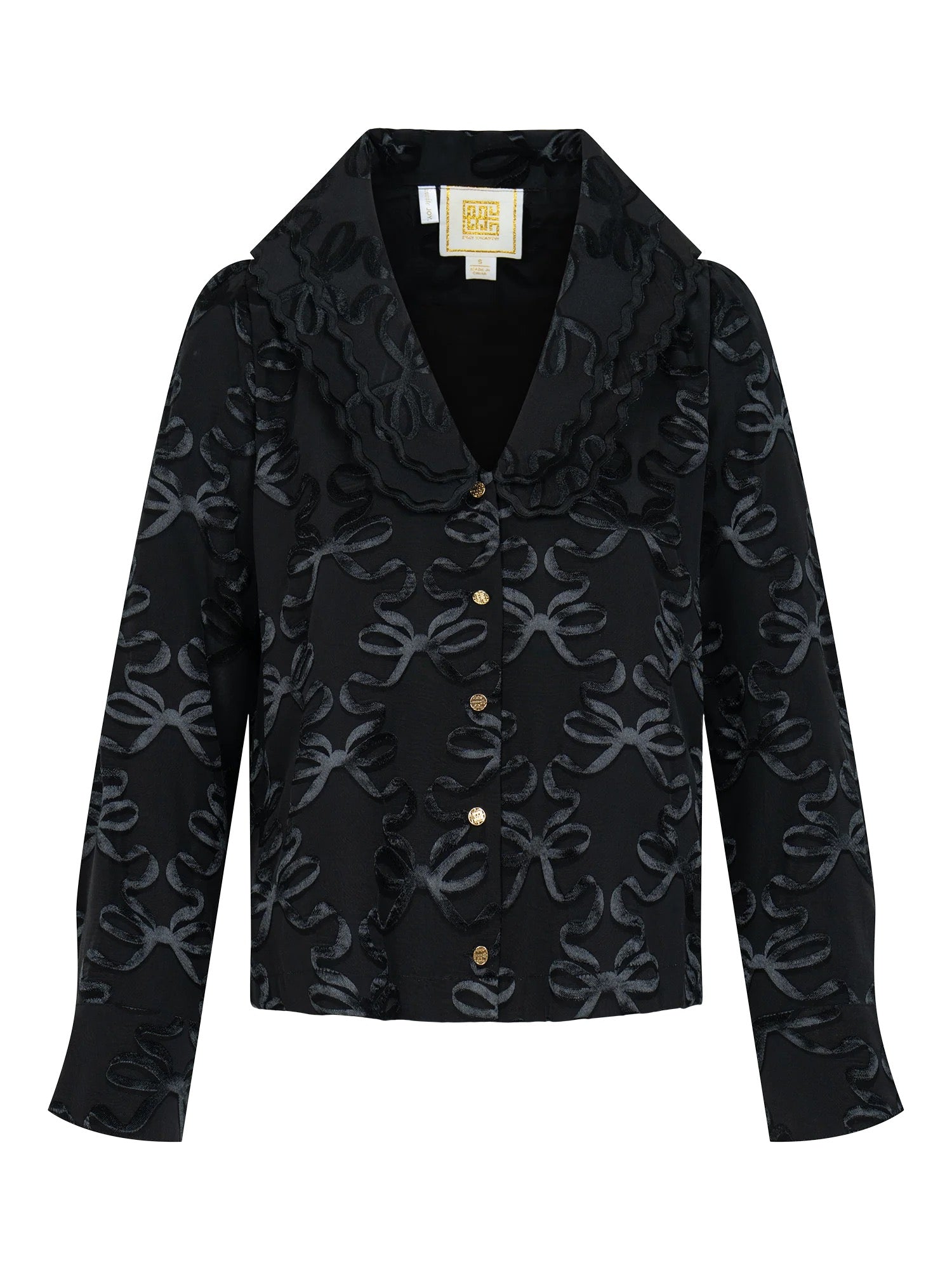 The Cameron Top in Bow Lattice features a scalloped collar, signature gold button front, pleated cuff sleeves, and a relaxed silhouette. Crafted in a tonal jacquard silk blend, the velvety bow motif adds rich texture and dimension. Lightweight with subtle sheen, this fabric highlights the lattice design while keeping the shape soft and wearable.