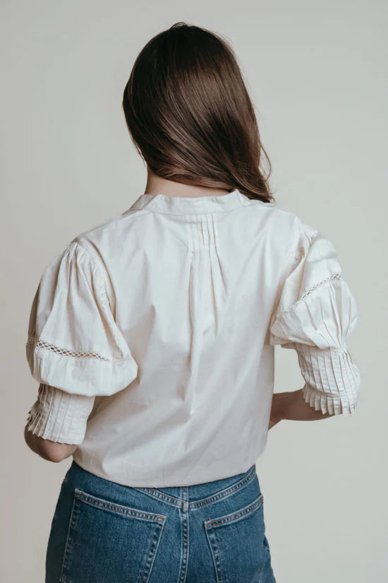 The Maria Top by La Roque is an effortless blend of feminine detail and everyday ease. Crafted in crisp cotton, this blouse features a flattering V-neckline with button-front closure and voluminous puff sleeves finished with delicate pleating and subtle lace insets. The slightly cropped silhouette makes it perfect for pairing with high-rise denim or skirts, giving you a chic, tailored look with minimal effort.