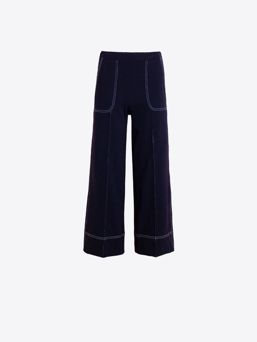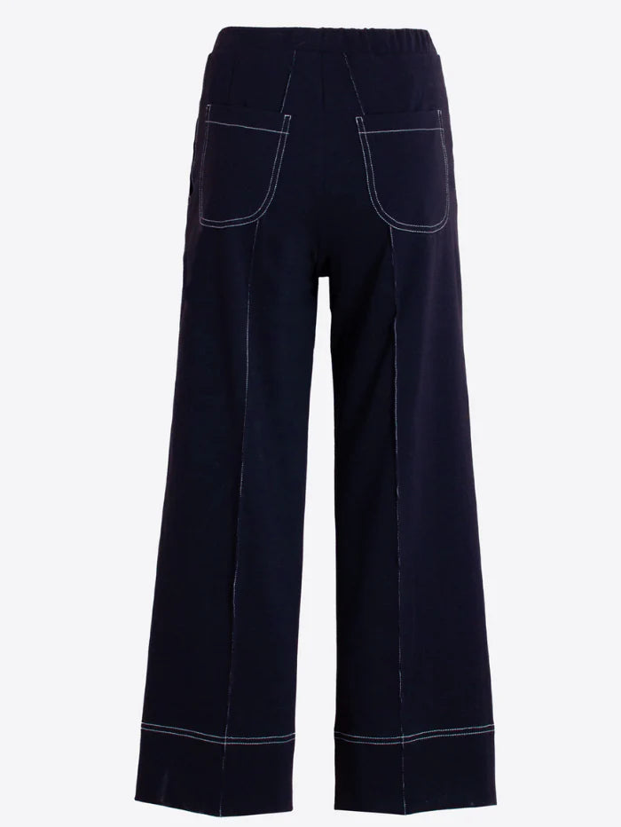 The Beti Pant is a modern classic with effortless polish. Designed in a deep navy hue, this wide-leg pant features a comfortable elastic waistband and contrast stitching that adds subtle detail and structure. Finished with front and back patch pockets and a relaxed silhouette, it blends tailored style with everyday ease.
